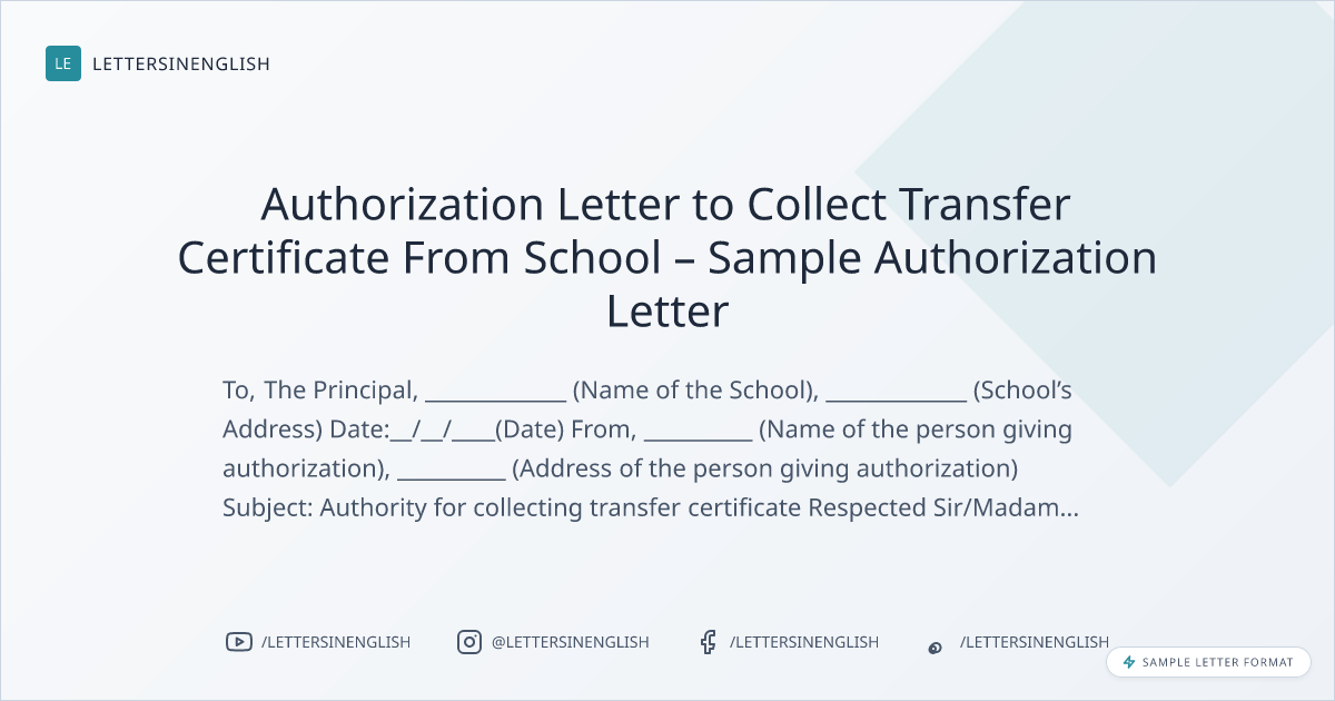 Authorization Letter to Collect Transfer Certificate From School – Sample Authorization Letter