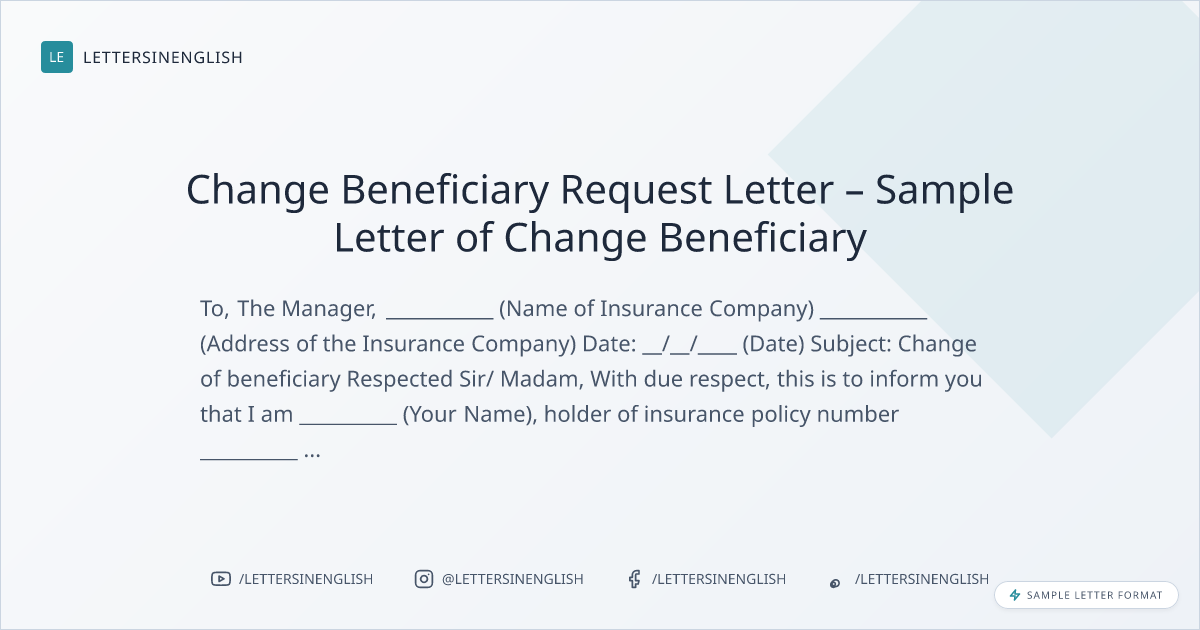 With due respect, this is to inform you that I am __________ (Your Name) holder of insurance policy number __________ (Mention Insurance Policy Number) at your renowned insurance company. I am writing this letter to request you to kindly change beneficiary from __________ (Name) to __________ (Name) for reason __________ (Mention Reason for the Change) with _________ (percent).