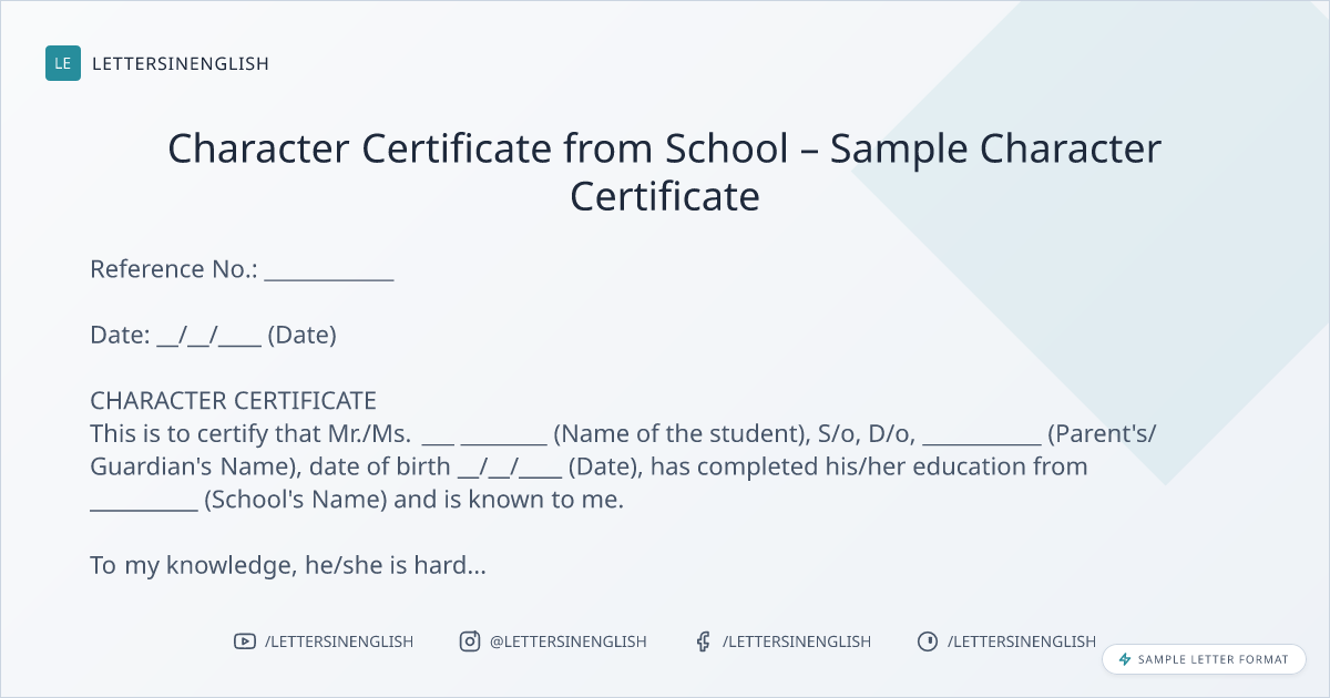 When composing a character certificate, it's essential to be clear and polite while emphasizing the positive qualities of the individual. Clearly state the name of the student, their parent's or guardian's name, date of birth, and the school's name. Highlight the student's positive attributes and moral character. Conclude with the school's name, signature or stamp, and the name and designation of the issuing authority.