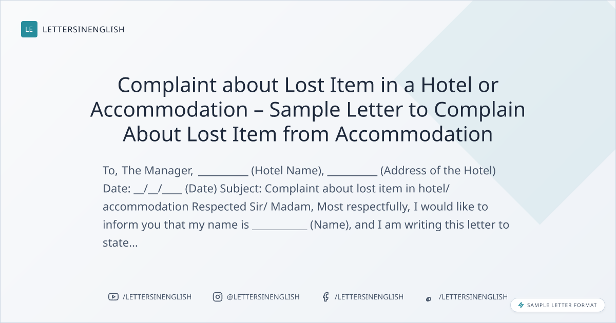 Complaint about Lost Item in a Hotel or Accommodation – Sample Letter to Complain About Lost Item from Accommodation