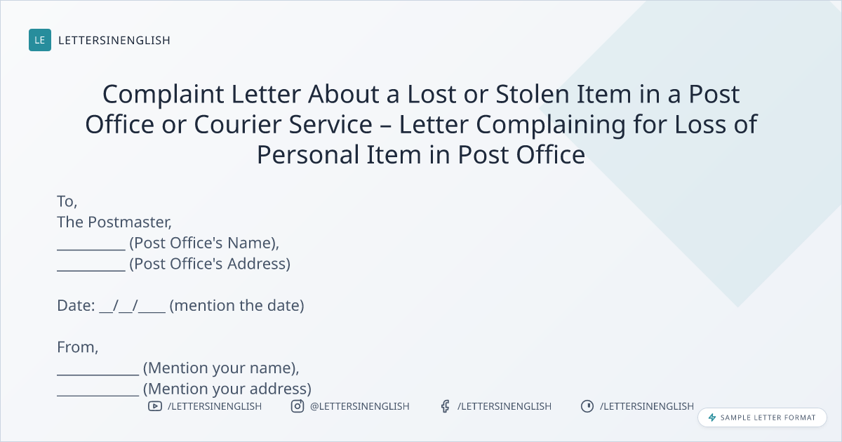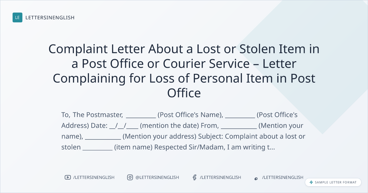 Complaint Letter About a Lost or Stolen Item in a Post Office or Courier Service – Letter Complaining for Loss of Personal Item in Post Office