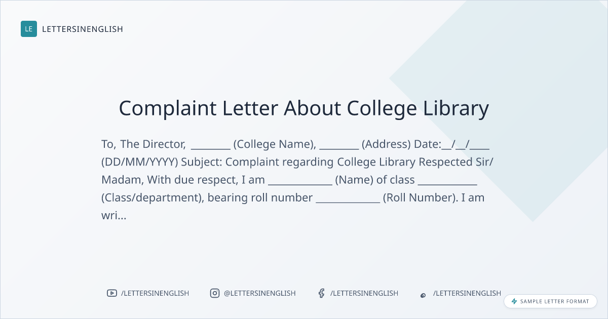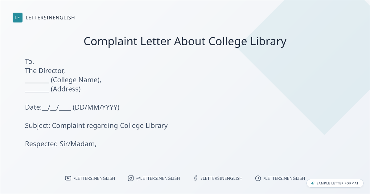 I am writing this letter in order to bring to your kind consideration, the condition of the college’s library. Sir/Madam most of the books are of very old edition and the topics and syllabus given in those books are from the previous year’s syllabus. __________________ (Mention all point).