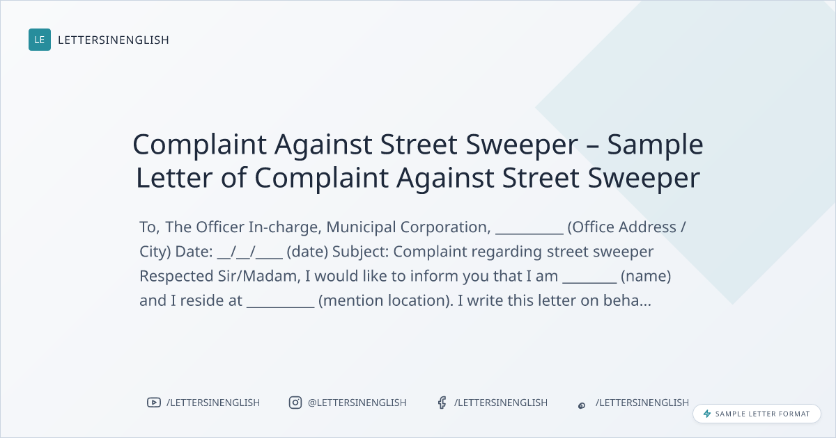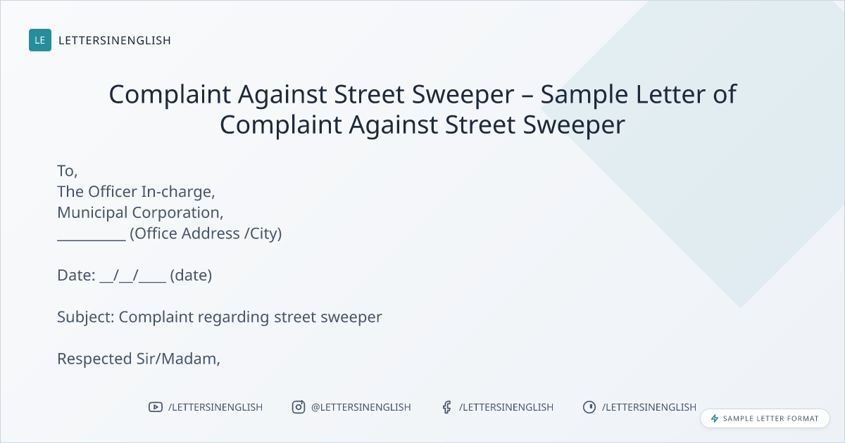 Complaint Against Street Sweeper – Sample Letter of Complaint Against Street Sweeper