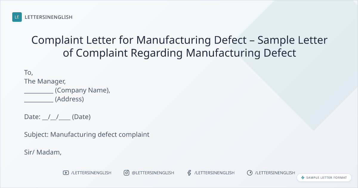 Complaint Letter for Manufacturing Defect – Sample Letter of Complaint Regarding Manufacturing Defect