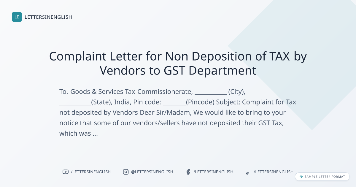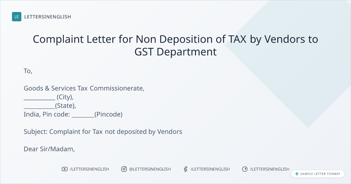 Complaint Letter for Non Deposition of TAX by Vendors to GST Department
