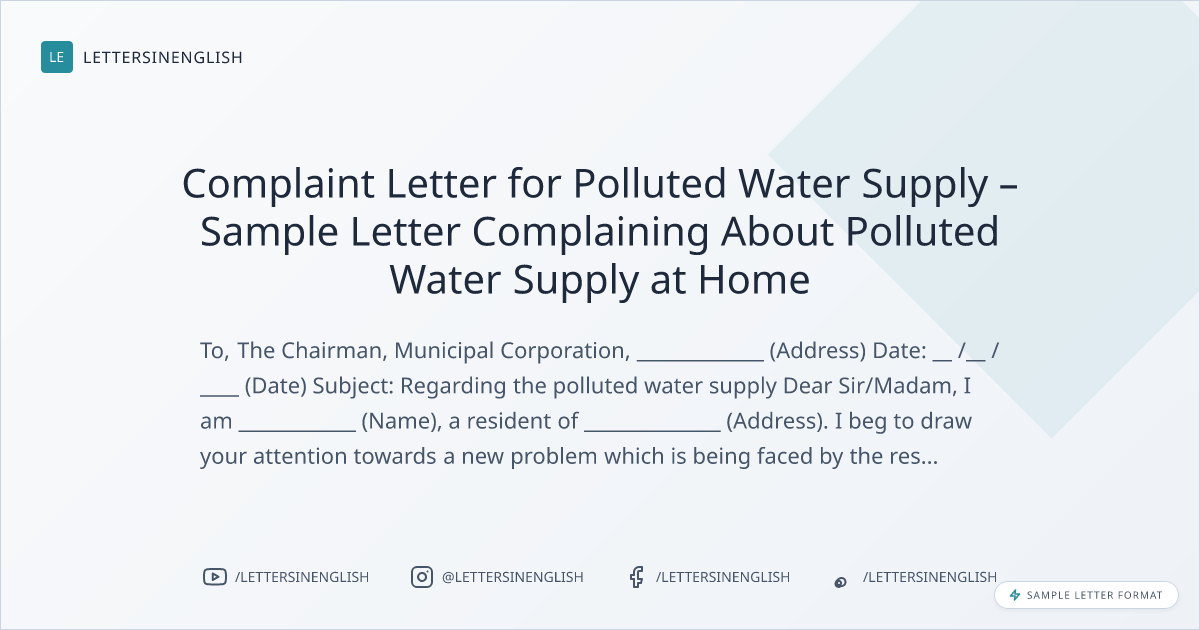 - Sample complaint letter for polluted water supply, polluted water complaint letter to Municipal Corporation: