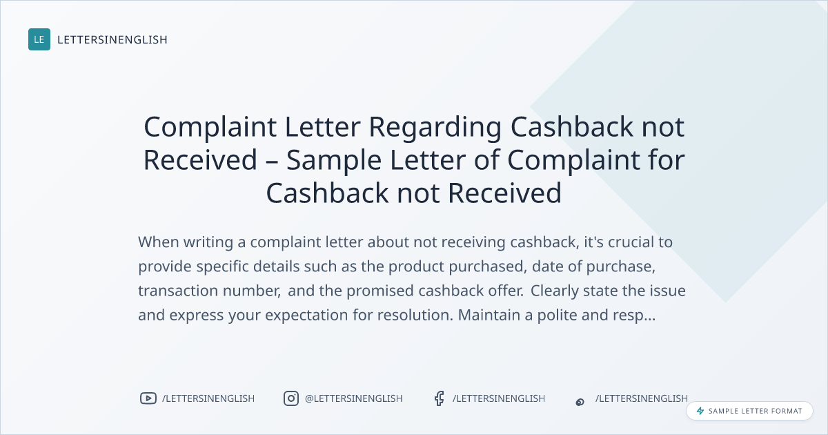 Complaint Letter Regarding Cashback not Received – Sample Letter of Complaint for Cashback not Received