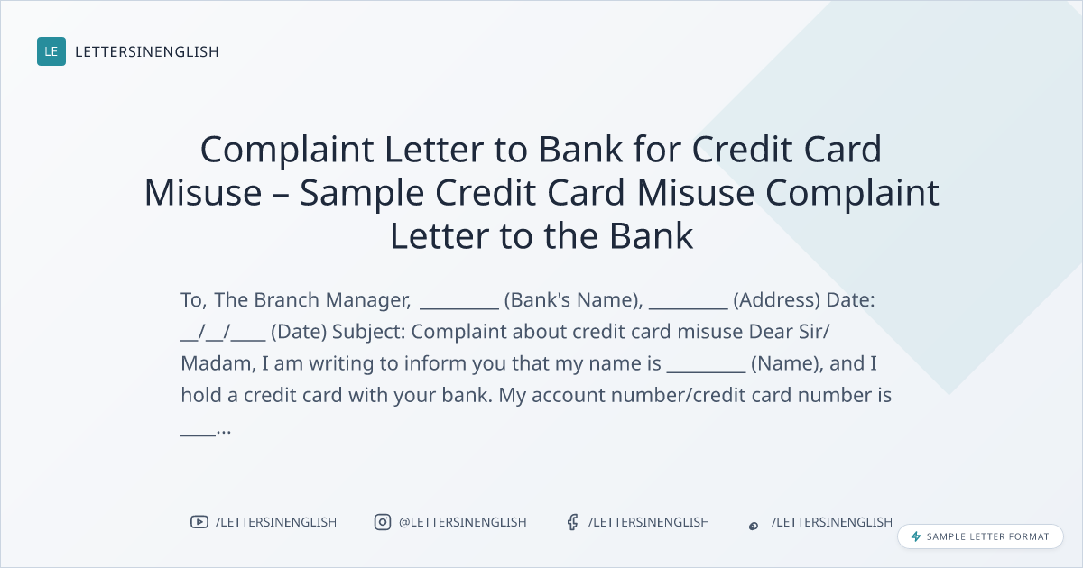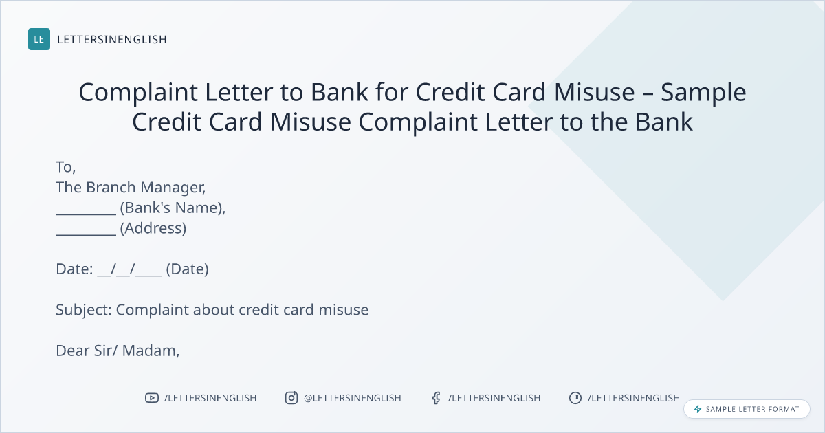 Complaint Letter to Bank for Credit Card Misuse – Sample Credit Card Misuse Complaint Letter to the Bank