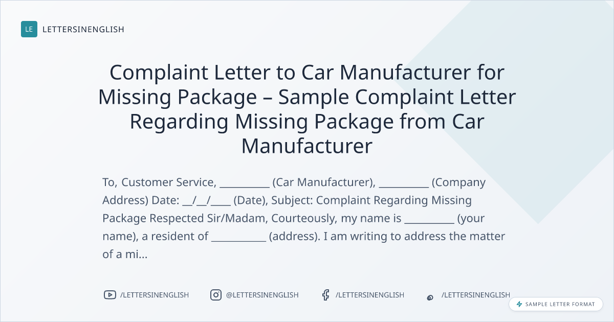 Complaint Letter to Car Manufacturer for Missing Package – Sample Complaint Letter Regarding Missing Package from Car Manufacturer