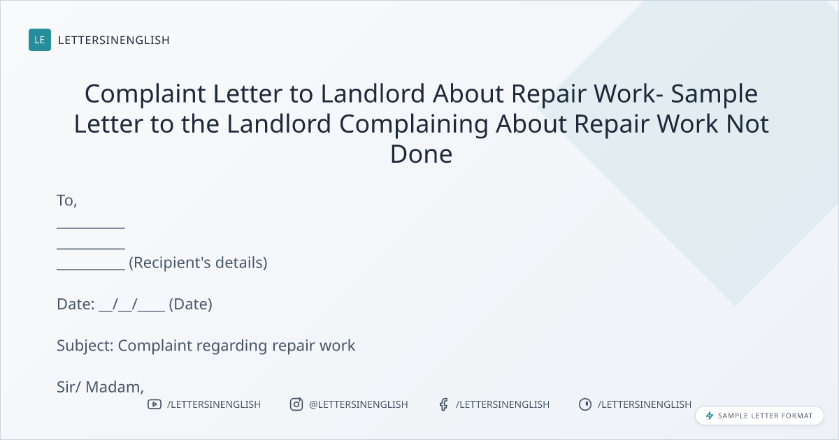 I would like to inform you that recently we had a conversation regarding the repair work required at your property but it’s already been _________ (number of days) and the repair work has not yet been started. Respected, __________ (the sink is leaking/ taps are leaking/ paint is peeling off) which is becoming a matter of concern to us. Hence, Kindly ensure to get the same done at the earliest in order to prevent cancellation of the contract as this is affecting my daily schedule and disturbing my family.