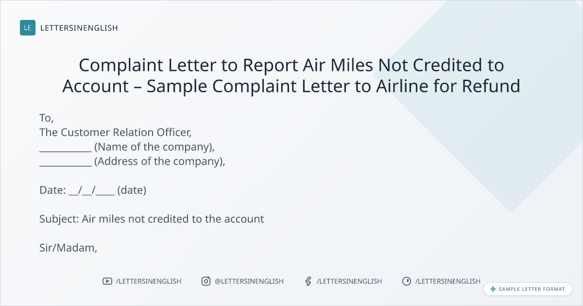 Complaint Letter to Report Air Miles Not Credited to Account – Sample Complaint Letter to Airline for Refund