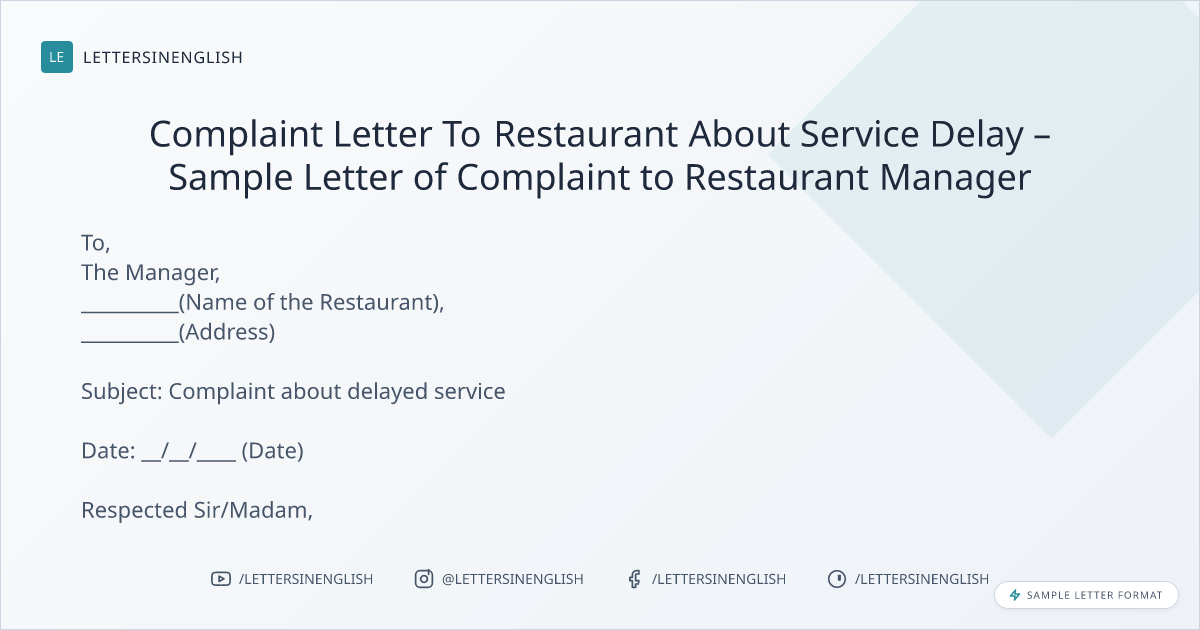 Complaint Letter To Restaurant About Service Delay – Sample Letter of Complaint to Restaurant Manager