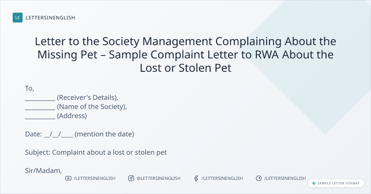 Letter to the Society Management Complaining About the Missing Pet – Sample Complaint Letter to RWA About the Lost or Stolen Pet