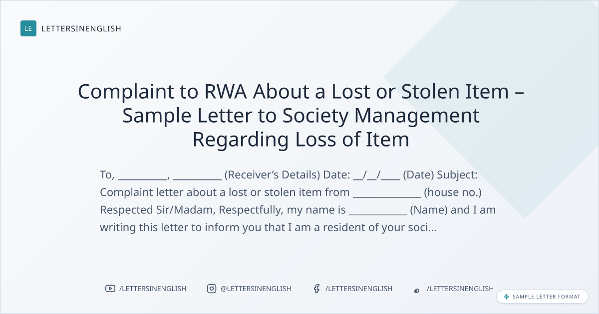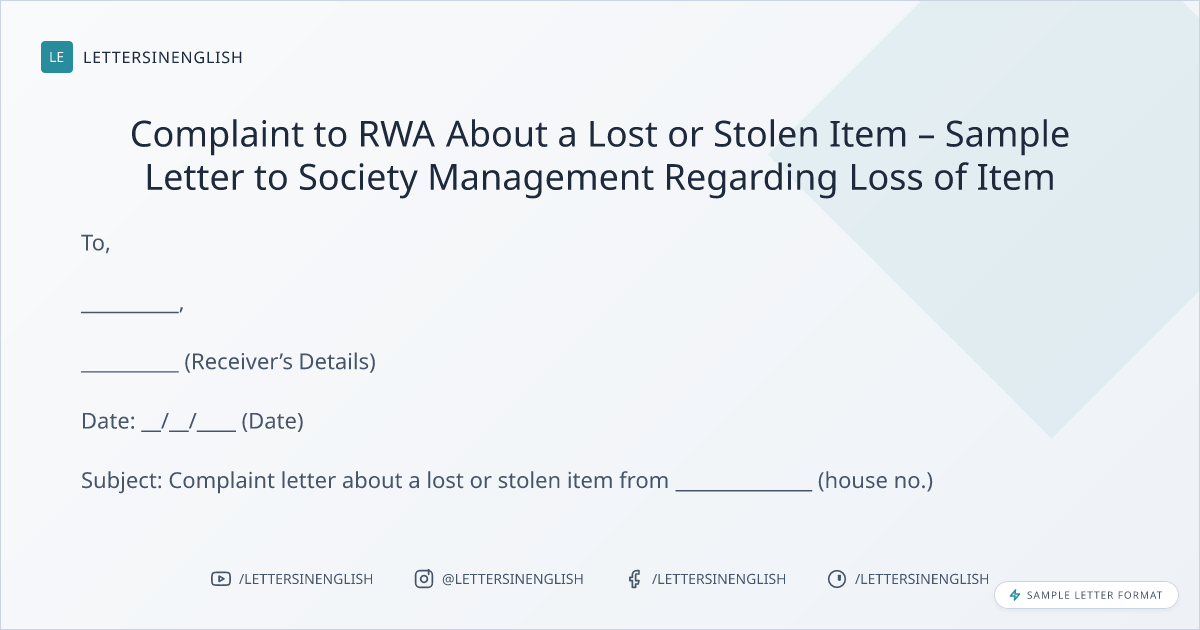 Complaint to RWA About a Lost or Stolen Item – Sample Letter to Society Management Regarding Loss of Item