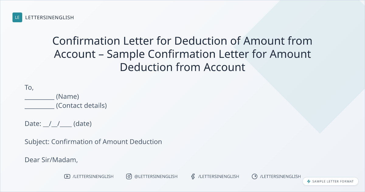 Confirmation Letter for Deduction of Amount from Account – Sample Confirmation Letter for Amount Deduction from Account