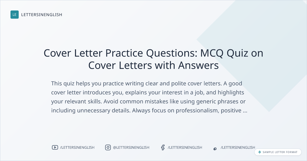 This quiz helps you practice writing clear and polite cover letters. A good cover letter introduces you, explains your interest in a job, and highlights your relevant skills. Avoid common mistakes like using generic phrases or including unnecessary details. Always focus on professionalism, positive tone, and tailoring the letter to the specific job.