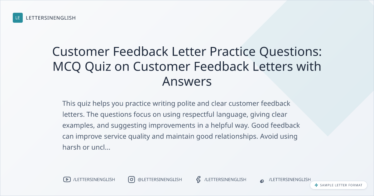 This quiz helps you practice writing polite and clear customer feedback letters. The questions focus on using respectful language, giving clear examples, and suggesting improvements in a helpful way. Good feedback can improve service quality and maintain good relationships. Avoid using harsh or unclear words to ensure your message is understood.