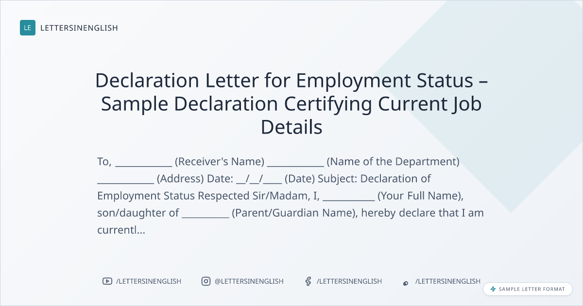 A declaration letter for employment status is a formal document where an individual certifies their job details, such as designation, duration of employment, and responsibilities. When writing such a letter, ensure that the tone is respectful and the content is clear. Avoid vague or incomplete details and verify the accuracy of all information provided. Always include your contact information for any further clarification.