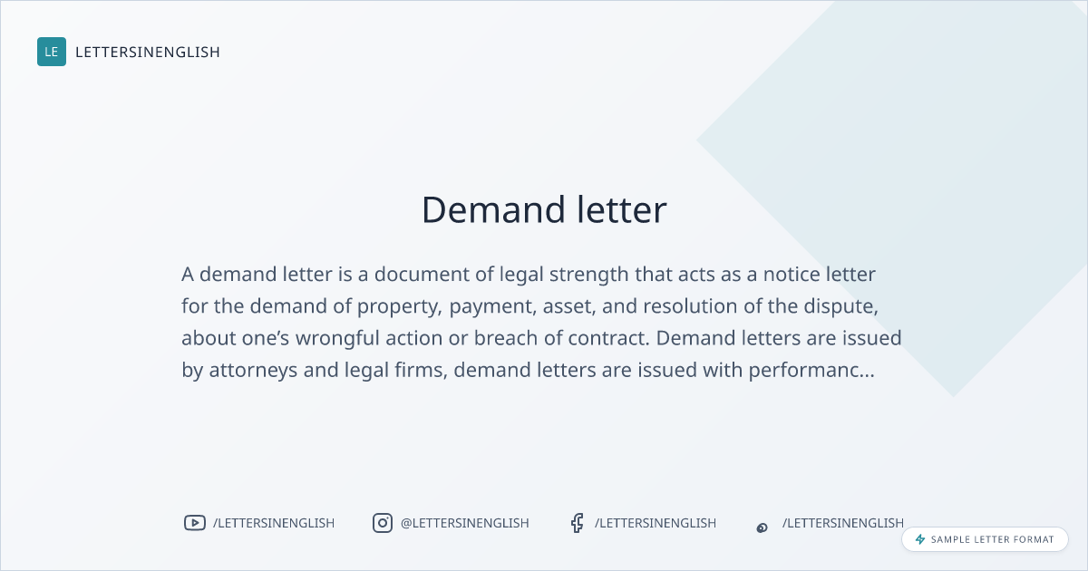 A demand Letter often refers to a settlement letter, claim letter, Notice Letter, or Judgment letter, the letter has a format specified with the Demand stated clearly.