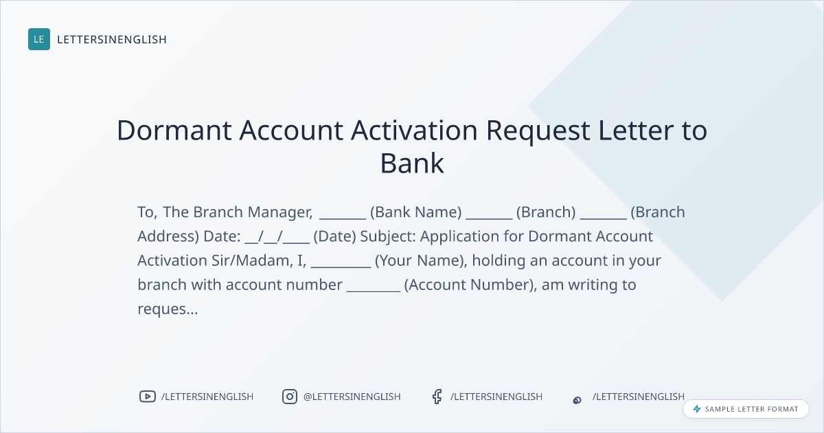 Note: For Dormant / Inactive Bank account activation, Bank may ask for additional documents like KYC, ID / Address proof, photo, Bank customer request form (CRF) along with the request letter. For dormant account activation please contact your Bank Branch.