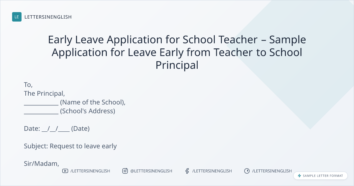 Early Leave Application for School Teacher – Sample Application for Leave Early from Teacher to School Principal