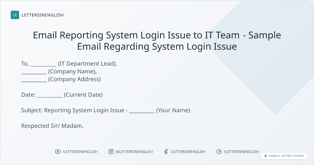 In your introduction, clearly state your purpose. For example, "I am writing to report a persistent issue I am experiencing with logging into the [Name of Reporting System] reporting system. My name is [Your Full Name] and I am from the [Your Department/Team] department." This immediately tells the IT team who you are and what system is affected.