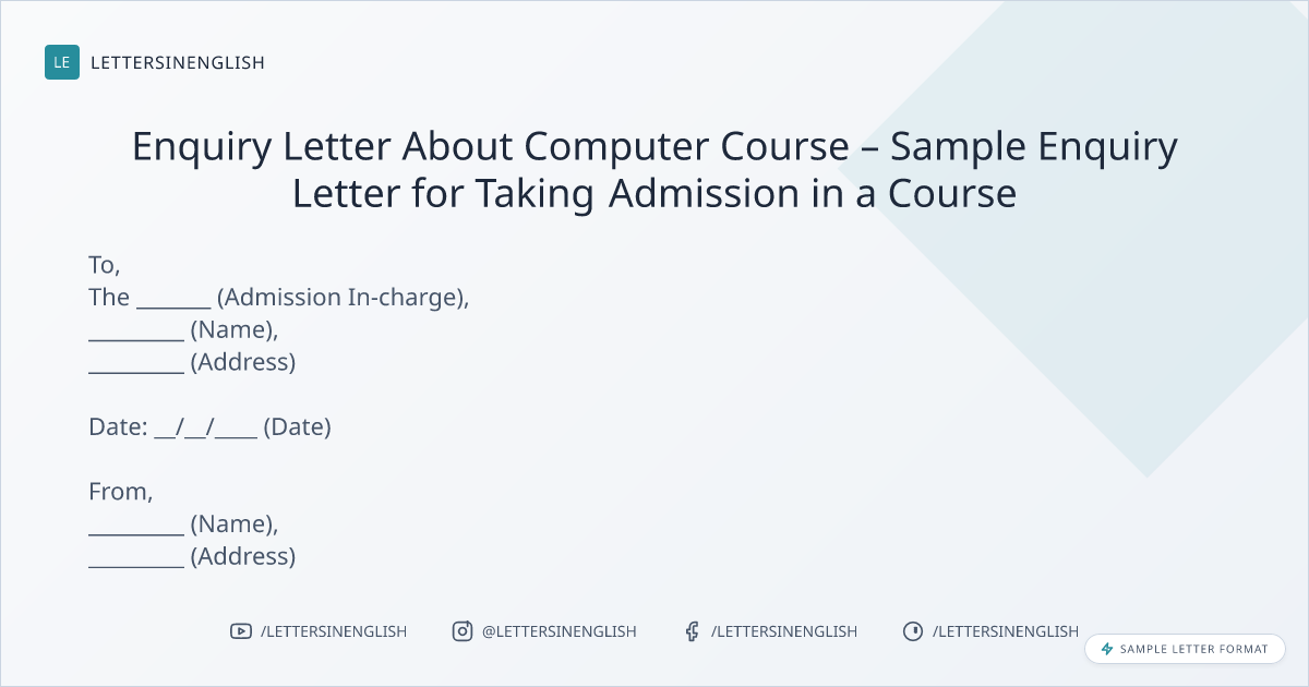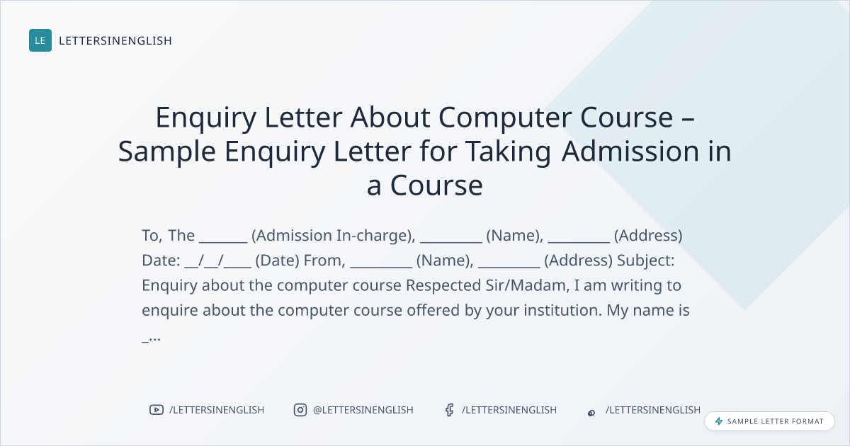 Enquiry Letter About Computer Course – Sample Enquiry Letter for Taking Admission in a Course