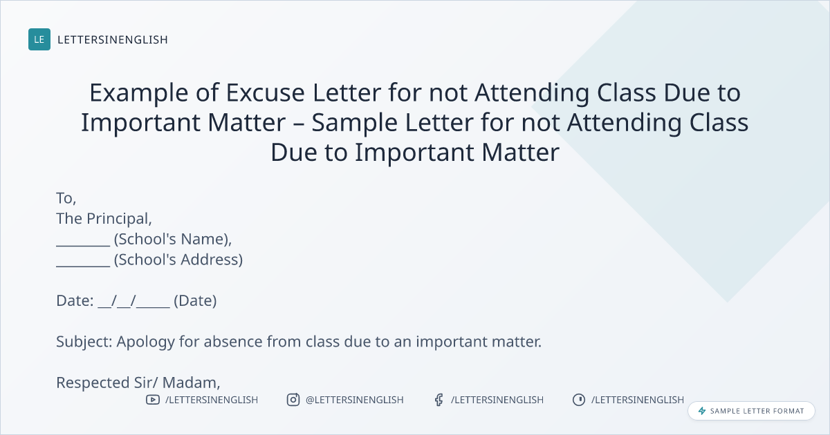 Example of Excuse Letter for not Attending Class Due to Important Matter – Sample Letter for not Attending Class Due to Important Matter