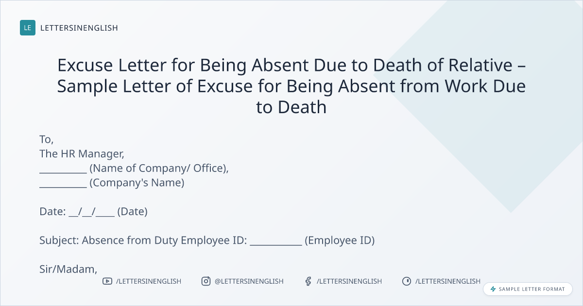 Excuse Letter for Being Absent Due to Death of Relative – Sample Letter of Excuse for Being Absent from Work Due to Death