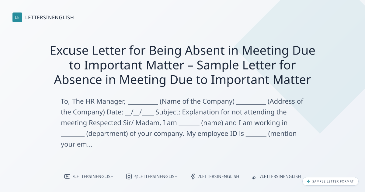 Excuse Letter for Being Absent in Meeting Due to Important Matter – Sample Letter for Absence in Meeting Due to Important Matter