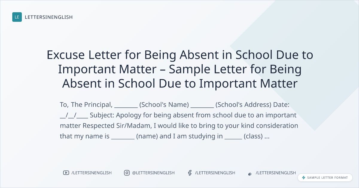 Excuse Letter for Being Absent in School Due to Important Matter – Sample Letter for Being Absent in School Due to Important Matter