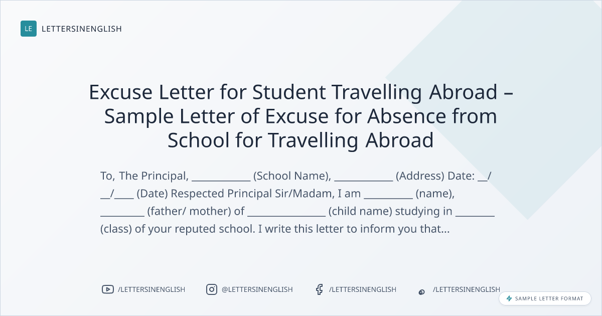 Excuse Letter for Student Travelling Abroad – Sample Letter of Excuse for Absence from School for Travelling Abroad
