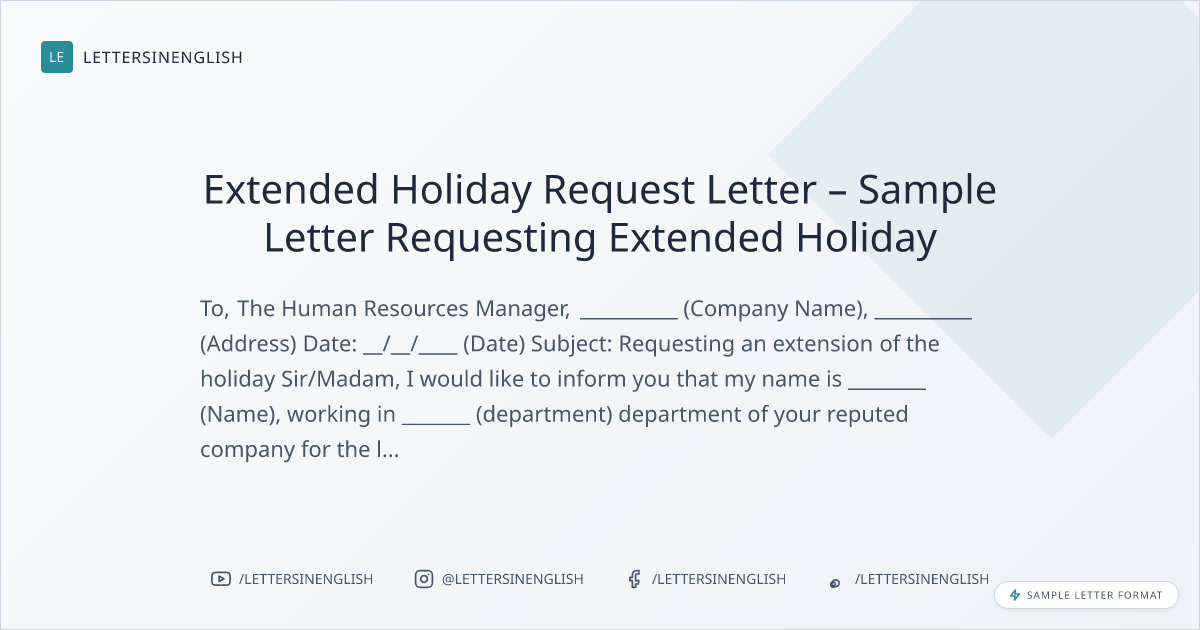 When writing an extended holiday request letter, it's crucial to maintain clarity and politeness. Clearly state your name, department, duration of employment, and employee ID. Provide details about the previously sanctioned leave and the reason for requesting an extension. Express gratitude for their consideration and offer to provide further information if needed.