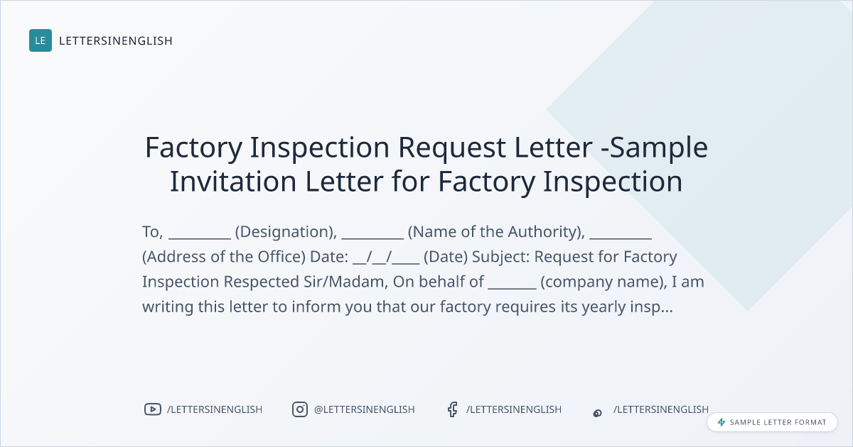 On behalf of _______ (company name), I am writing this letter in order to notify you that as per the legal safety norms, the yearly inspection of our factory is due on __/__/____ (date). In this regard, we would like to invite you to the factory inspection for ____________ (mention purpose). Kindly, schedule the inspection between __/__/____ (date) to __/__/____ (date) to avoid any inconvenience. In case of any query or clarification, you may reach us at ___________ (contact details).