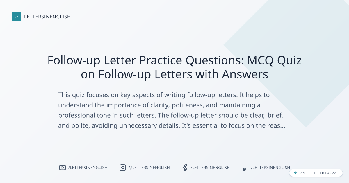 This quiz focuses on key aspects of writing follow-up letters. It helps to understand the importance of clarity, politeness, and maintaining a professional tone in such letters. The follow-up letter should be clear, brief, and polite, avoiding unnecessary details. It’s essential to focus on the reason for the follow-up and include all necessary information to avoid any confusion.