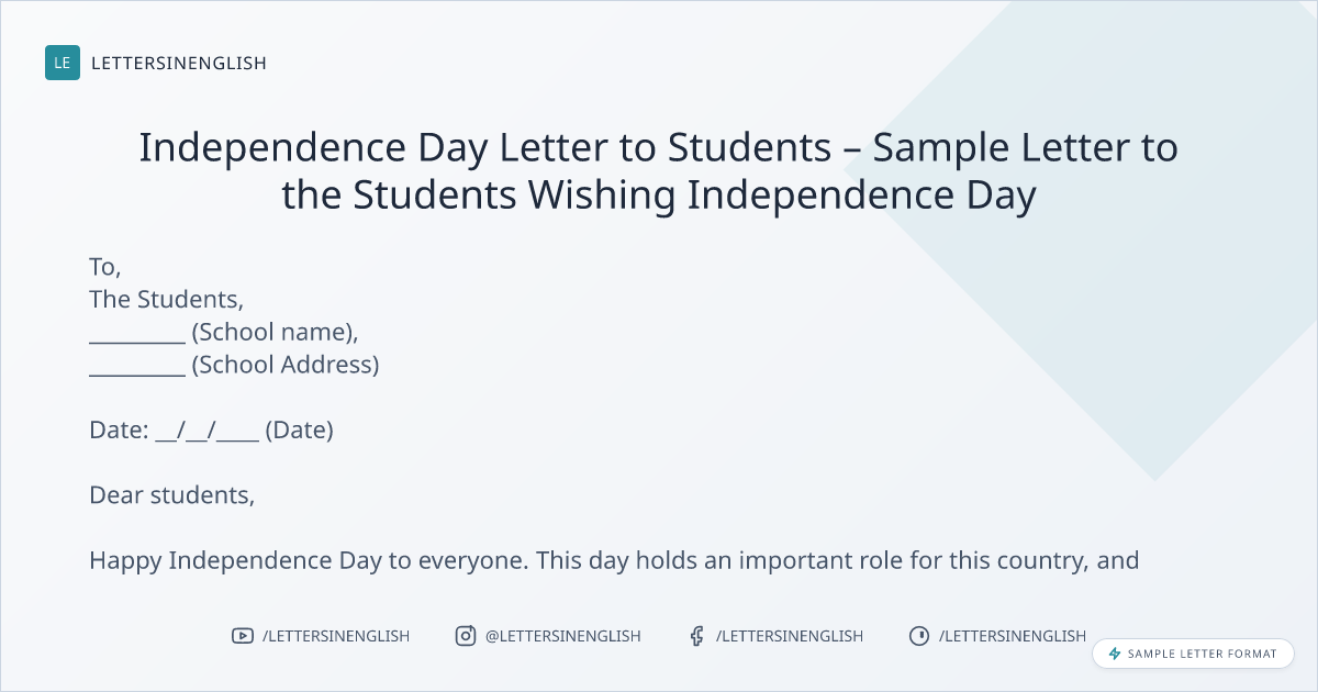 In writing a letter like this one for Independence Day to students, clarity and politeness are essential. Expressing wishes for the occasion and reminding students of its significance should be done with clarity and respect. Avoid unclear language and ensure the message conveys the importance of honoring the sacrifices made for freedom.