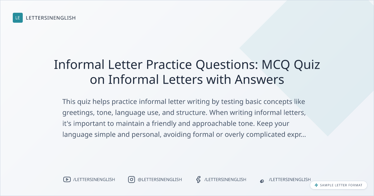 This quiz helps practice informal letter writing by testing basic concepts like greetings, tone, language use, and structure. When writing informal letters, it’s important to maintain a friendly and approachable tone. Keep your language simple and personal, avoiding formal or overly complicated expressions. Pay attention to the details, such as the proper way to address the reader and close the letter. Being clear and polite, without using unnecessary formalities, makes informal letters more engaging and natural.