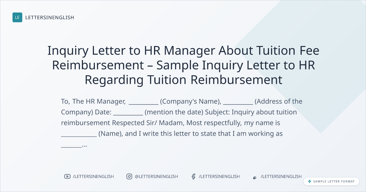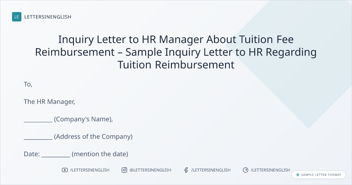 Inquiry Letter to HR Manager About Tuition Fee Reimbursement – Sample Inquiry Letter to HR Regarding Tuition Reimbursement