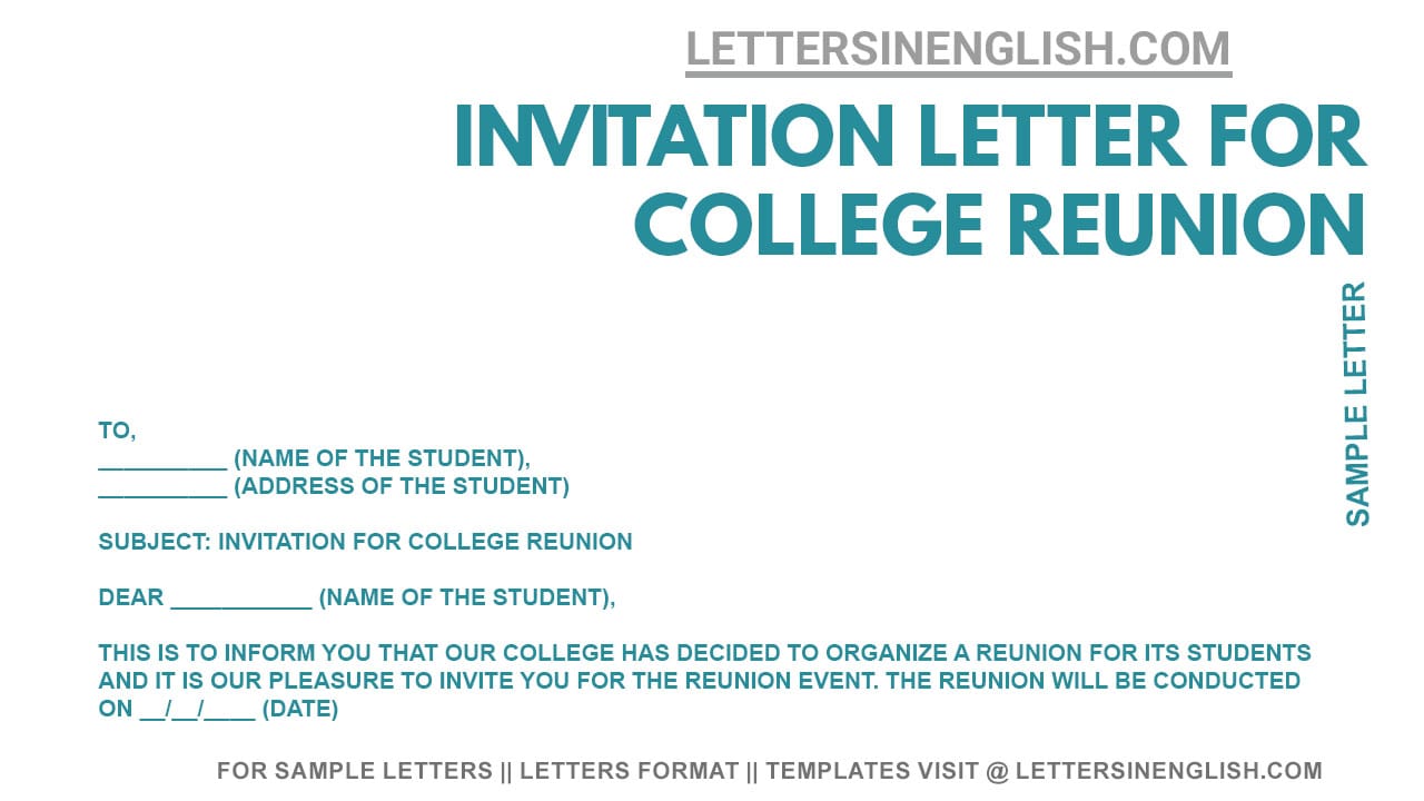 This is to inform you that our College has decided to organize a reunion for its students and it is our pleasure to invite you to the reunion event. The reunion will be conducted on __/__/____ (date) at ___________ (mention venue). The pass-out students from _____ (year/ batch) till ______ (batch/ year) are hereby invited to be a part of this event.