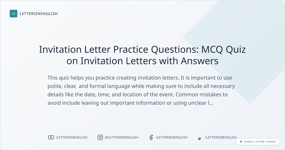 This quiz helps you practice creating invitation letters. It is important to use polite, clear, and formal language while making sure to include all necessary details like the date, time, and location of the event. Common mistakes to avoid include leaving out important information or using unclear language. Being polite and direct ensures that the recipient understands the invitation and can respond appropriately.