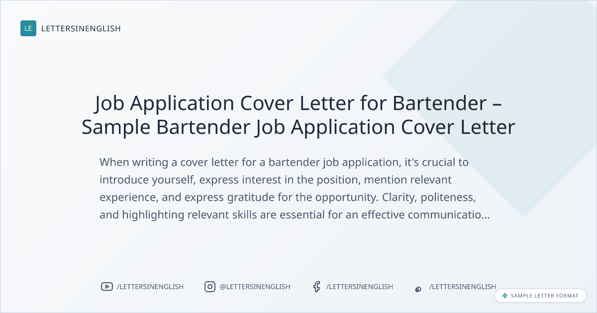 Job Application Cover Letter for Bartender – Sample Bartender Job Application Cover Letter