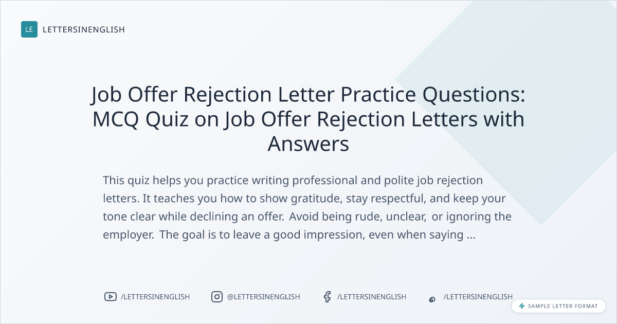 This quiz helps you practice writing professional and polite job rejection letters. It teaches you how to show gratitude, stay respectful, and keep your tone clear while declining an offer. Avoid being rude, unclear, or ignoring the employer. The goal is to leave a good impression, even when saying no.