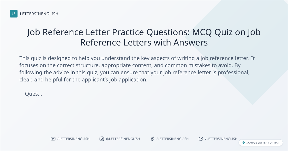 This quiz is designed to help you understand the key aspects of writing a job reference letter. It focuses on the correct structure, appropriate content, and common mistakes to avoid. By following the advice in this quiz, you can ensure that your job reference letter is professional, clear, and helpful for the applicant’s job application.