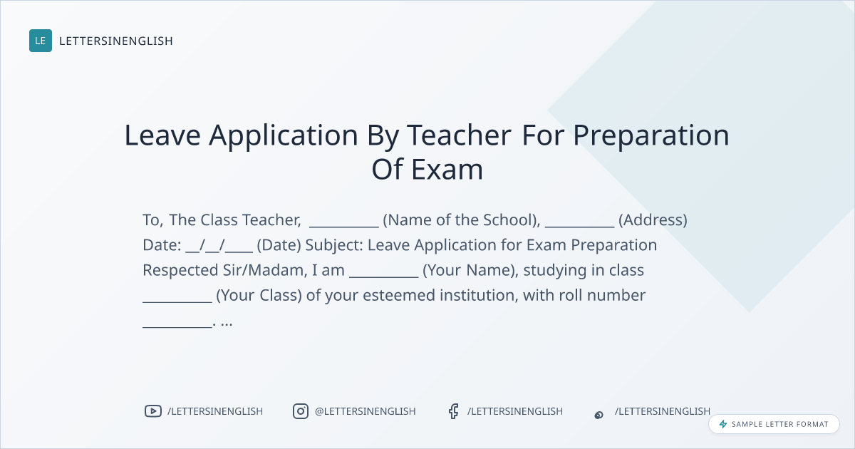 I am writing this letter to inform you about my __________(Type of exam – PGT/ TGT/ B Ed/ M Ed) exam will be held on __________ (Examination date). I request you to grant me leaves from __________ (Date) to __________(Date) for the preparation of my exam. This will help me grow and will give a boost to my career opportunities.