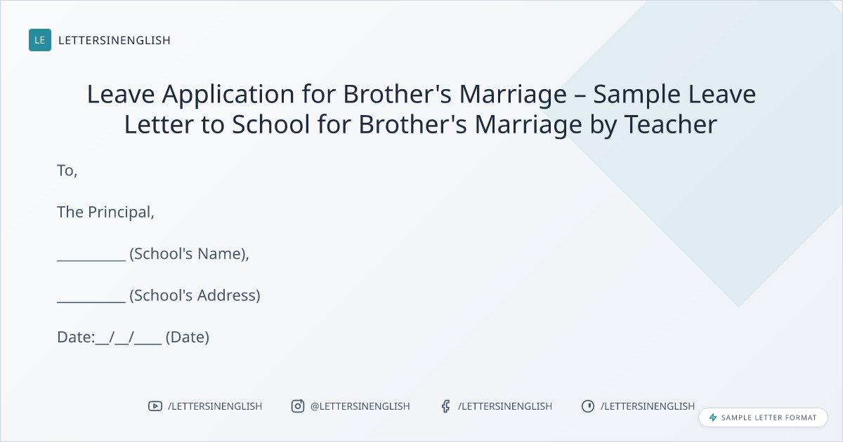 Leave Application for Brother’s Marriage – Sample Leave Letter to School for Brother’s Marriage by Teacher