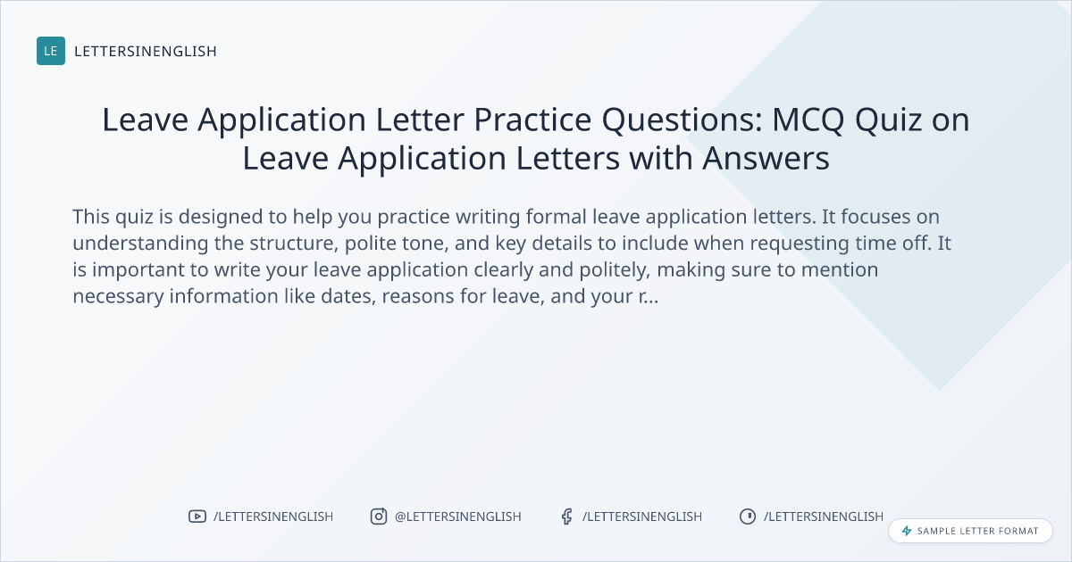 This quiz is designed to help you practice writing formal leave application letters. It focuses on understanding the structure, polite tone, and key details to include when requesting time off. It is important to write your leave application clearly and politely, making sure to mention necessary information like dates, reasons for leave, and your return. Avoid informal language or leaving out important details, as this may confuse the reader. Being respectful and clear will help your application be more effective.
