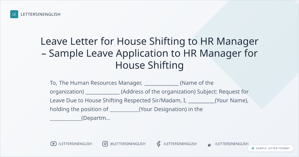 Leave Letter for House Shifting to HR Manager – Sample Leave Application to HR Manager for House Shifting