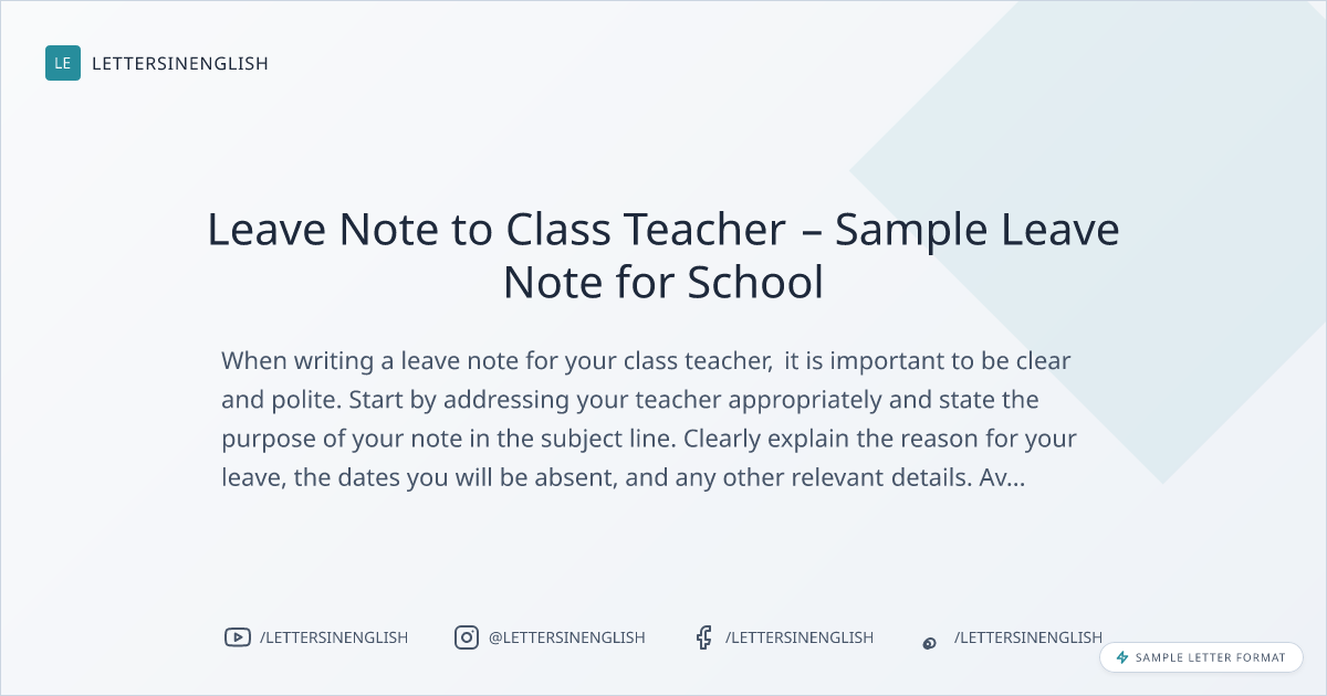 When writing a leave note for your class teacher, it is important to be clear and polite. Start by addressing your teacher appropriately and state the purpose of your note in the subject line. Clearly explain the reason for your leave, the dates you will be absent, and any other relevant details. Avoid using unclear language or omitting important information. Maintain a respectful tone and express gratitude for their understanding. Conclude with a polite request for approval.