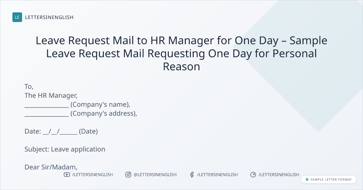 Leave Request Mail to HR Manager for One Day – Sample Leave Request Mail Requesting One Day for Personal Reason