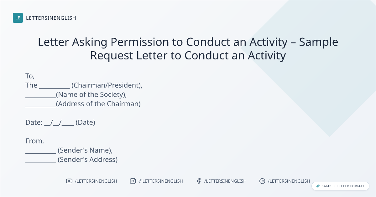 I am writing this letter to seek your kind permission for conducting an activity __________ (Activity – Fun Activity/ Marketing/ Sports/ Dance Event/ Cultural Activity/ etc.) in our society at __________ (Venue – lawn / party hall). This activity will be conducted on __________ (Date), from ______ (Time) to ______ (Time) with a gathering of __________(Number of people).